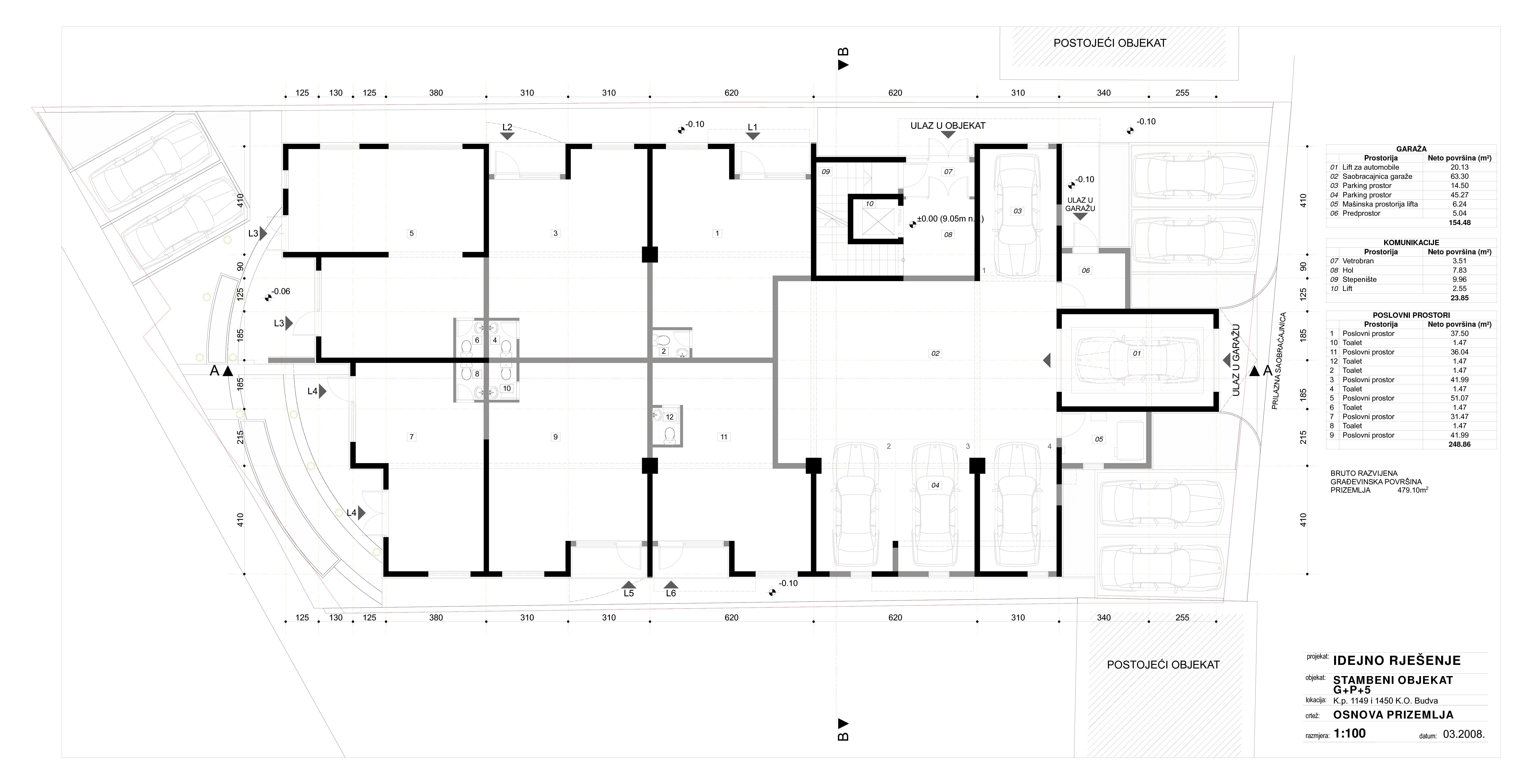 Glavni i Izvođački projekat Stambeno-poslovnog objekta sa garažom - Vujović, na KP 1449 i 1450, površine cca. 3,600m2, Budva |